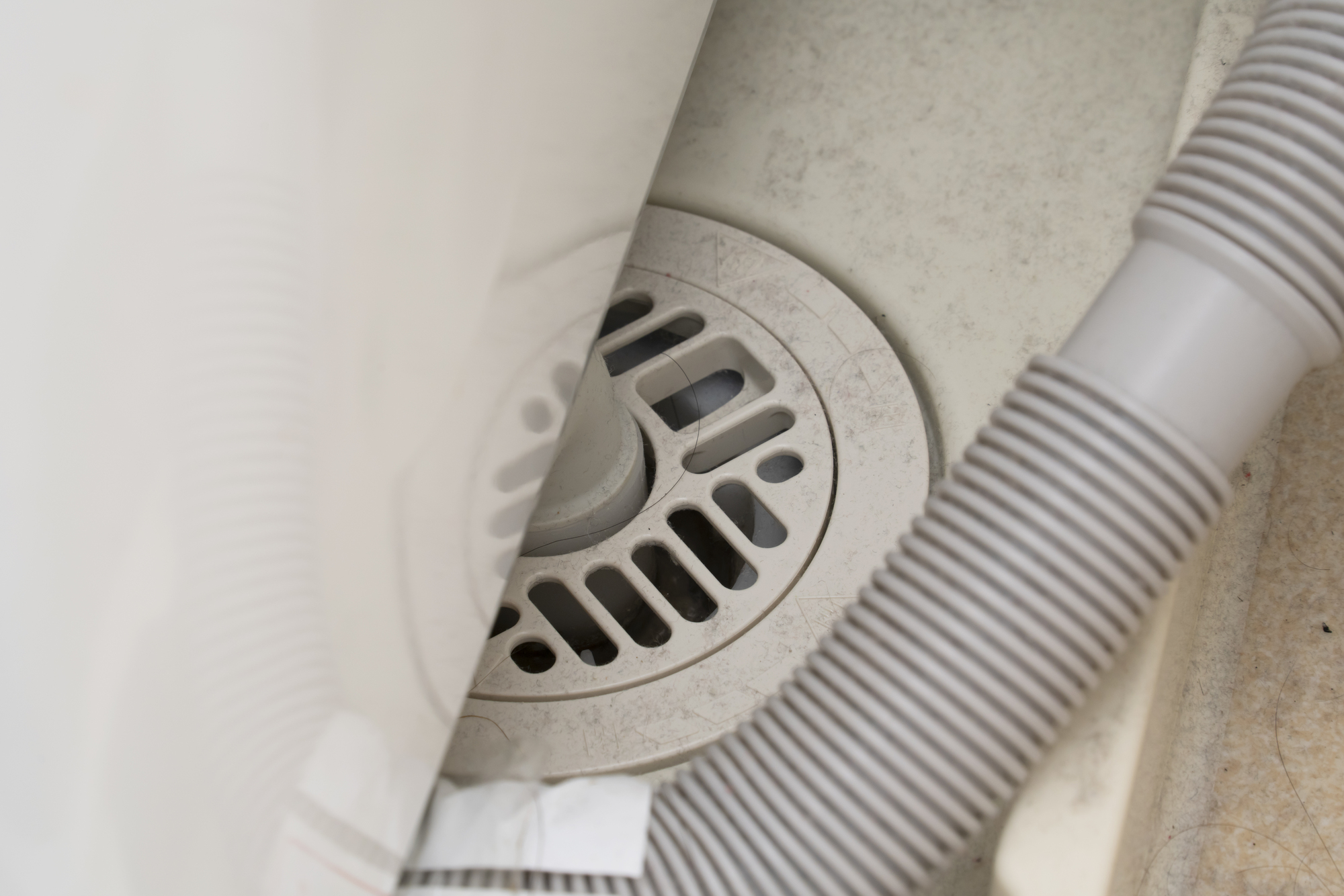 排水口が洗濯機の真下、あるいは四隅の奥深くに隠れており、腕を伸ばしても指先が触れるのがやっと、という状態です。